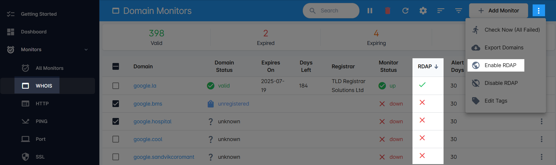 - The RDAP column indicates if RDAP is enabled for the monitor. You can sort by this column.
